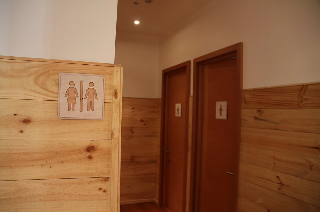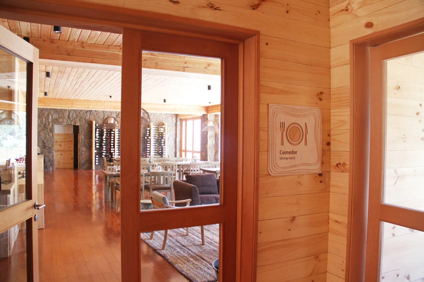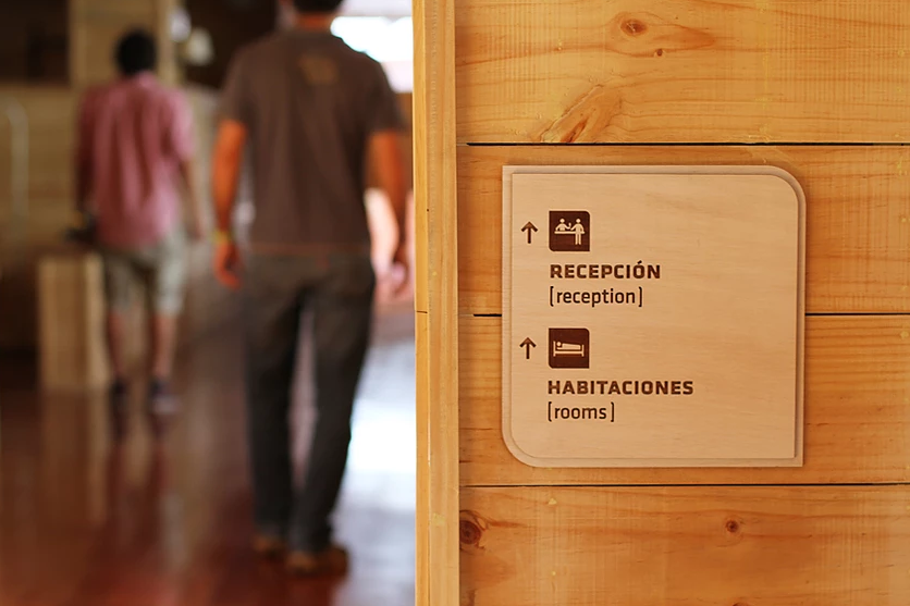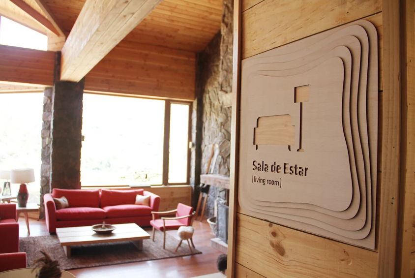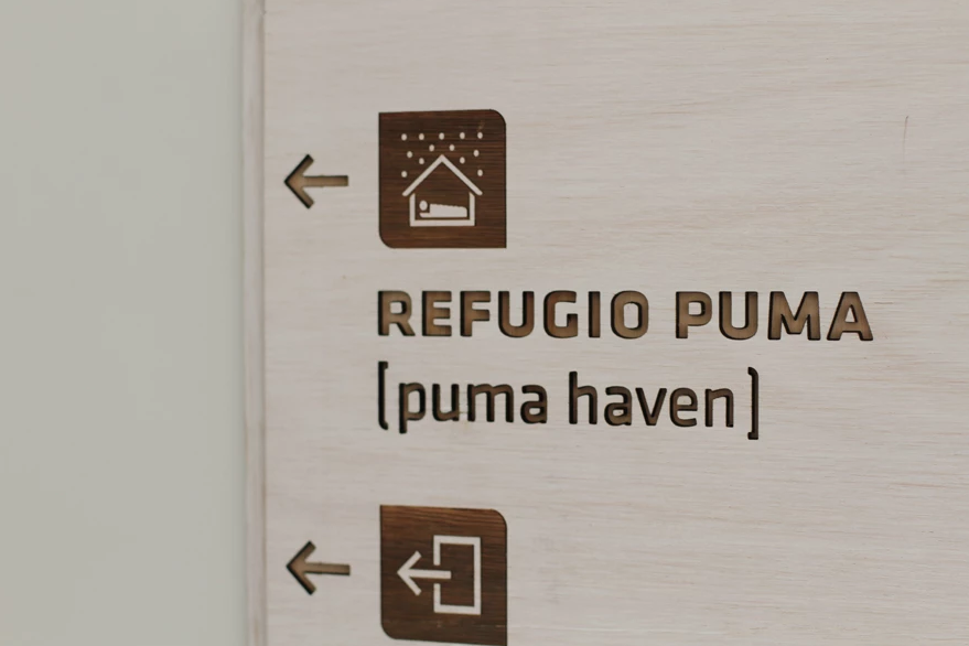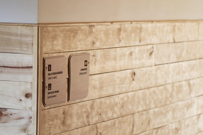 A partir de la identidad de Puma Lodge, desarrollamos un sistema de señalética que dialoga directamente con la arquitectura en madera y piedra del hotel. Diseñamos placas en madera natural, con cantos suaves y capas superpuestas que evocan curvas de nivel y las siluetas de la cordillera. Sobre ellas, los pictogramas y textos fueron resueltos mediante calado y grabado láser, logrando un contraste sutil pero claramente legible, manteniendo siempre una estética cálida y de lodge de montaña.