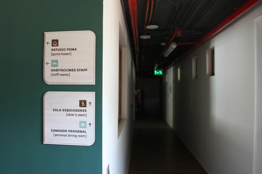 La información se organizó en un sistema jerárquico de señalización direccional, identificatoria y de orientación general, completamente bilingüe (español–inglés) para atender tanto al público internacional de heli-esquí como a los visitantes de temporada baja. Cada ícono se diseñó a partir de elementos propios del lugar —habitaciones, refugios, comedor, sala de estar, áreas de actividades— de modo que el recorrido por el interior del hotel fuera intuitivo, coherente con la marca y alineado con la experiencia aventurera y exclusiva de Puma Lodge.